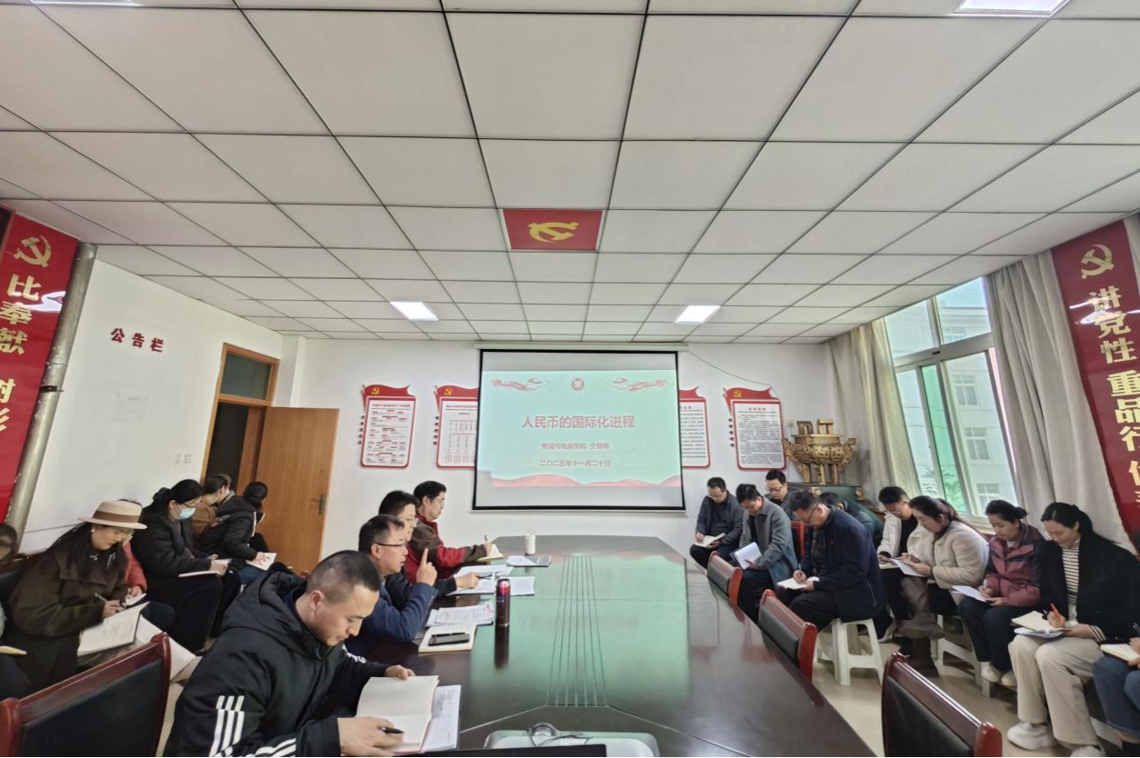 2025年11月20日下午,物流电商学院党委书记仝晓明在院会议室为教工党员上了主题为“人民币国际化进程”的党课。