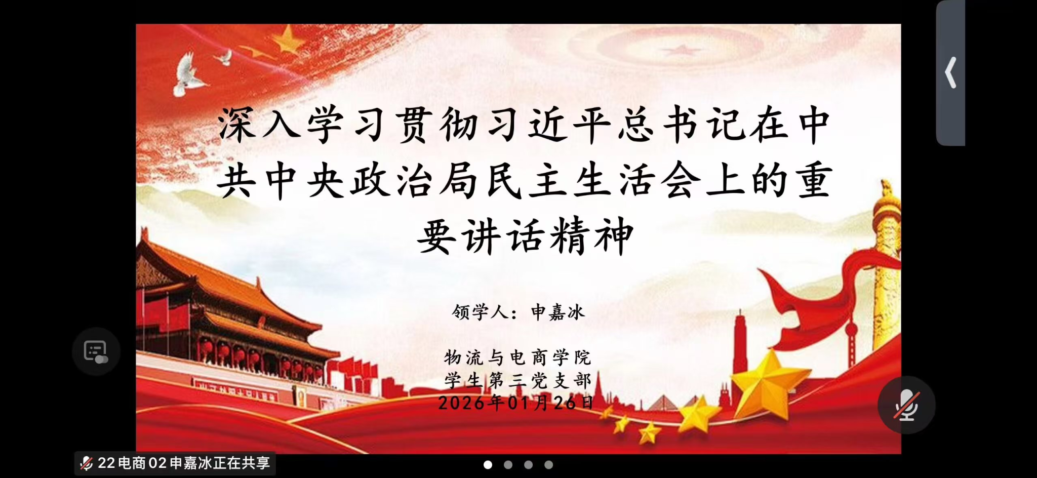 物流与电商学院学生第一、二、三党支部于1月23日和1月26日在腾讯会议线上平台开展了一月份主题党日活动。本次会议由学生党支部书记尚津、党旭豪、杨雪出席,学生第一、二、三党支部全体在校生党员参与。