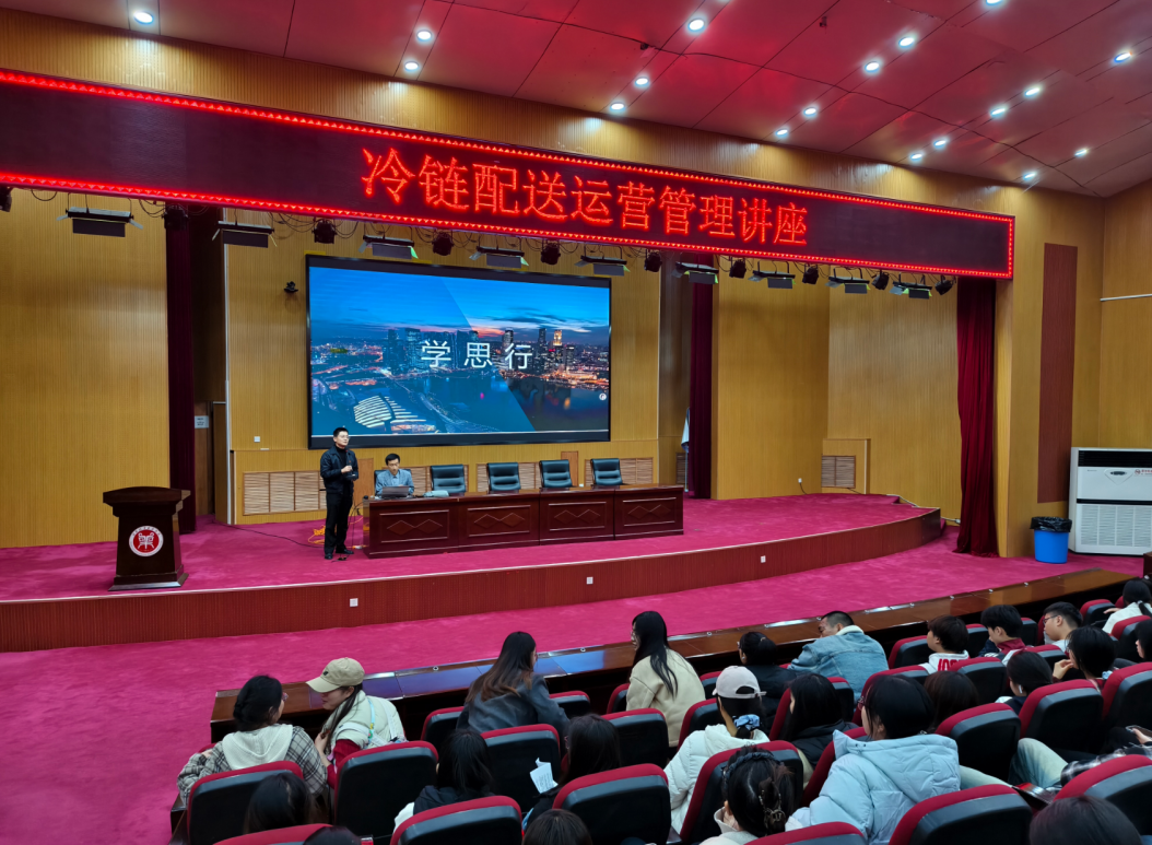 为进一步发挥学院冷链物流专业特色优势,拓宽学生专业视野,深化产教融合与校友资源协同育人机制,11月14日19:00—20:30物流与电商学院在英才校区学术报告厅举办“冷链配送运营管理”专题讲座。学院特邀中国冷链物流百强企业郑州华夏易通物流公司市场管理中心总监、我校2011级物流专业校友朱华侨作主题报告。讲座由学院院长任佳佳主持,学院教师孙红霞博士、薛珂老师参加。物流专业24级、25级全体学生及部分毕业班学生到场聆听。