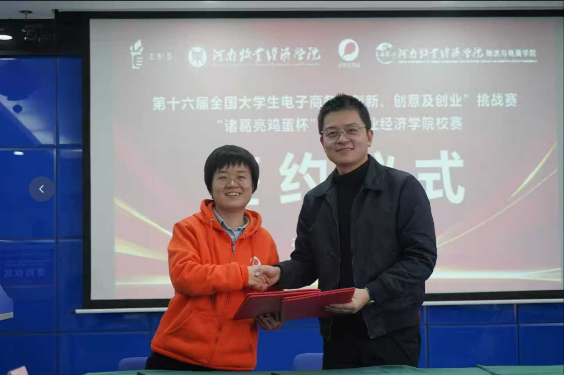 随后,企业人员和调研团队就产学研合作开展了深入座谈。首先,赵战军董事就牧翔生物的业务体系、当下痛点及未来的发展规划做了系统阐述。任佳佳院长首先感谢牧翔生物对学院电商三创赛的赞助,然后从学院的专业设置、人才培养等方面做了全面介绍,并表示双方可以在企业的品牌建设、营销推广、物流等方面开展深入合作。李金峰副院长重点介绍了学院的师资和科研情况,并表示在冷链运输、跨国物流等方面学院有坚实的科研基础,日后可以进一步探讨合作。接下来,双方围绕横向科研、实践型人才需求与培养、学科竞赛赞助、日常教学融合等方面开展了深入探讨。最后,为进一步推进校企合作,举行了河南诸葛亮食品有限公司冠名电子商务三创赛校赛的签约仪式。