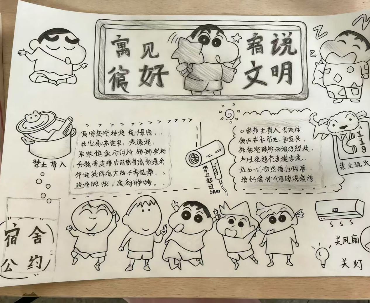 此次活动让同学们在创作与实践中深化文明宿舍建设意识,将“文明”理念转化为具体可守的宿舍约定,为打造整洁有序、温馨友爱的宿舍环境,为推进校园文明建设奠定了坚实基础。
